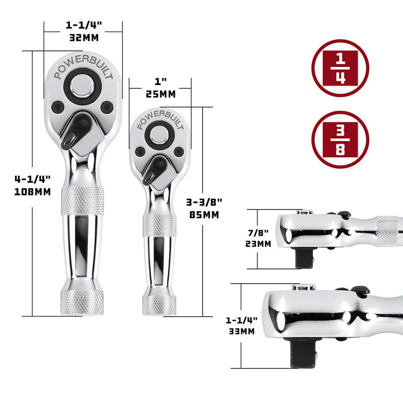 - Includes 1/4-Inch and 3/8-Inch drive ratchets