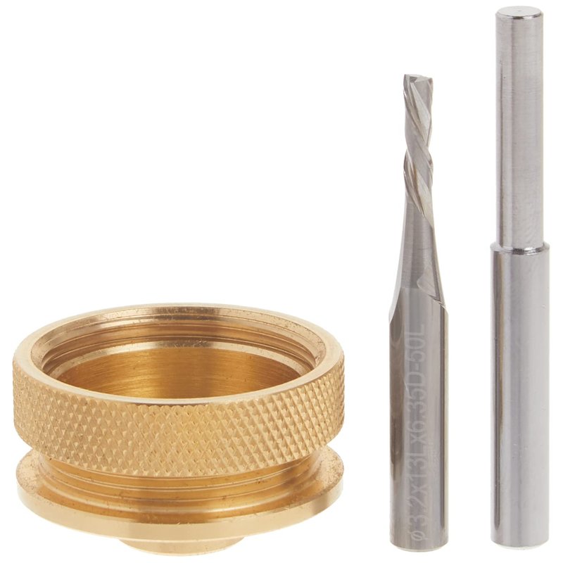 - INCLUDES: (1) 1/8" solid carbide spiral router bit with 1/4" shank (1) brass inlay bushing with retaining nut (1) snap-on brass collar (1) handy alignment pin