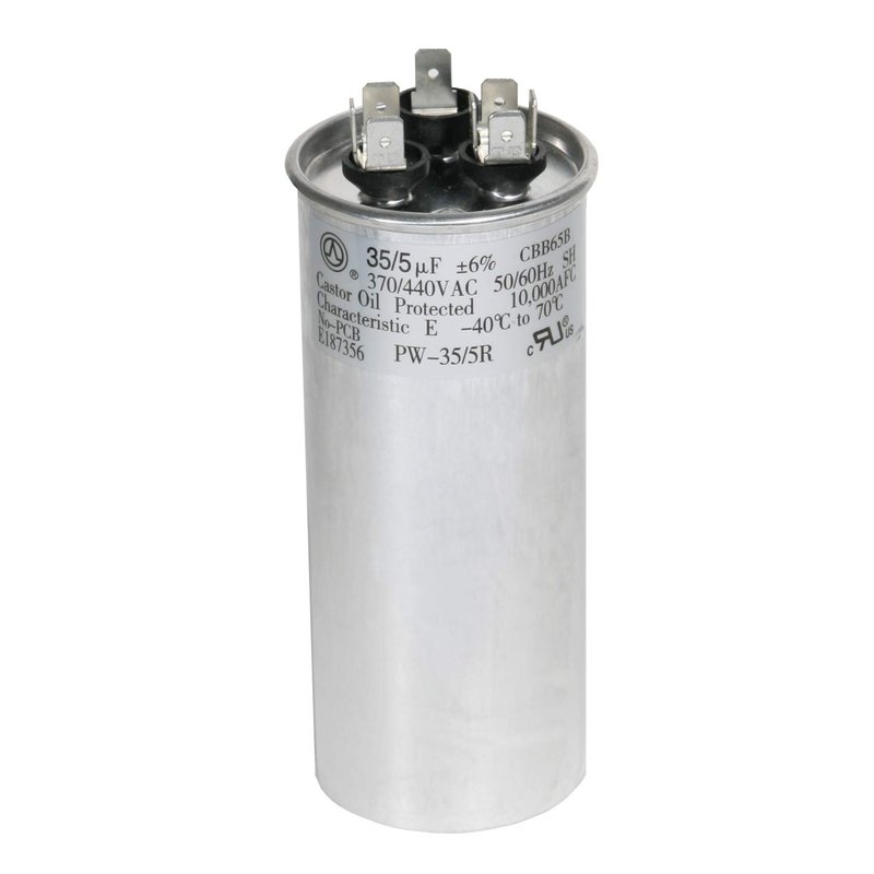 - 35/5 uf or MFD micro farad 440 Volt Dual Run Round AC Capacitor . Replaces BOTH 370 & 440 VAC capacitors