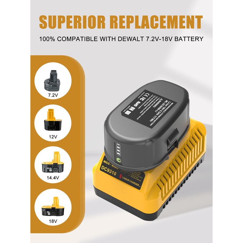 - Broad Match: Replacement for DEWALT Battery Charger DC9310, DW9116, DW9226, DW9118, DC9319, DC9320. Compatible with DEWALT 7.2V-18V NiCad & NiMh XRP Battery (CAN'T charge Lithium battery but support powilling 18v lithium battery).