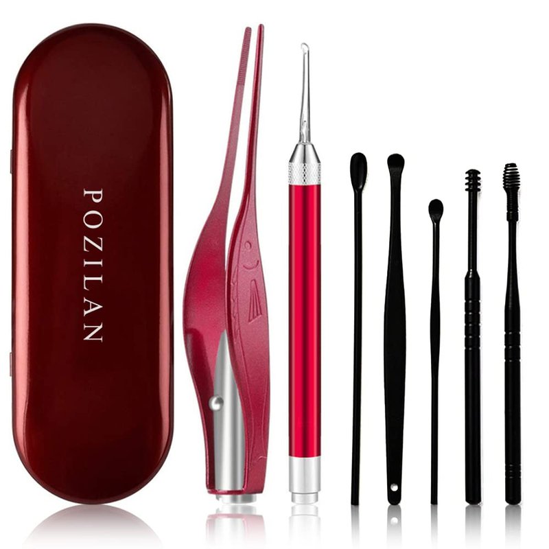 POZILAN Ear Picker Tweezers with LED Light - 8 Pack Ear Wax Removal Tool Cleaner Kit for Kids and Adults, Earwax Spoon Digger & Tweezers for Ear Cleaning Tool Gift Set