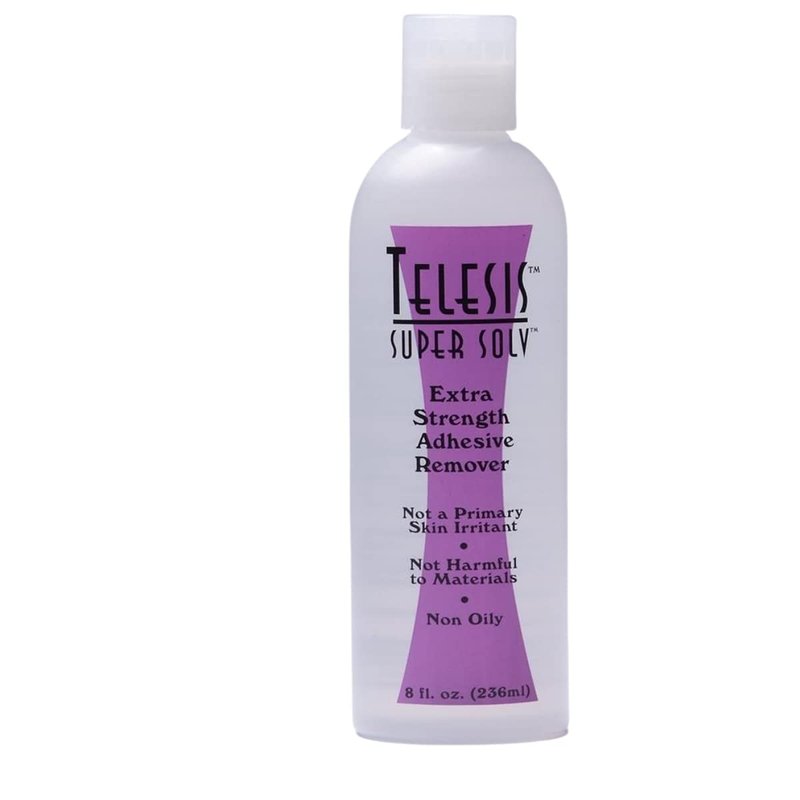 SUPER SOLV - strongest and most popular adhesive and prosthetic remover. Hydrocarbon based, mildly scented, SUPER SOLV provides rapid removal of adhesives and prosthetics without damage to appliances and latex foam. Excellent for use on delicate lace wigs and skin. Non-oily and not harmful to materials. Also available in 1.3 oz dab-on, 4 oz., 8 oz., and 1/2 Gallon sizes.