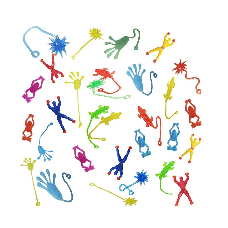 This is a gooey, stretchable little toy that is fun to play with and a favorite toy .Just throw it out and it sticks firmly to the glass . High quality rubber material, safe little gifts. 30 pieces super value pack ,contains 5 models including small hand, meteor hammer, little man, little frog and lizard, 6 each . Reward toys and small gifts for birthday party.
