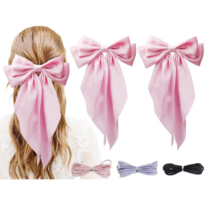PQZKLDP 2PCS Silky Satin Hair Bows Big Versatile Hair Bows Cute Clips for Girls & Women Pink Hair Bow Ribbons Oversized Long Tail Metal Clips Bowknot Aesthetic Hair Accessories (PD 210)