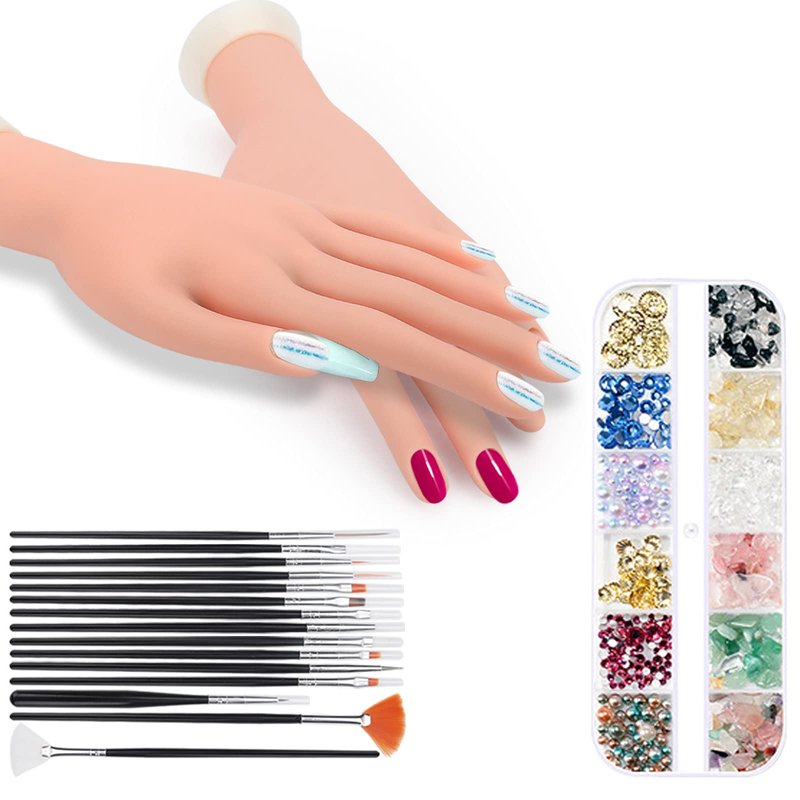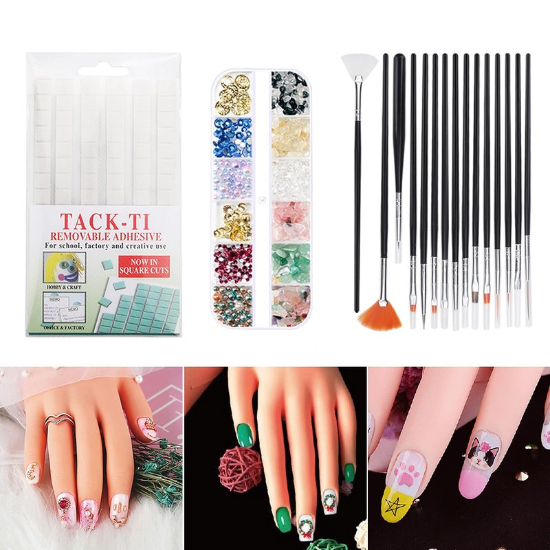 - [Practical Nail Art Set] This set has 1 rubber fake hand + 100pcs natural nails + 102pcs nail clay + 1 box of rhinestone decoration + 15pcs painting pen + 2 files. Natural nails can be pasted on practice hands with clay and used. After that, you can use painting pens and rhinestones to design and draw nail patterns. It is the best nail set for nail shops and home DIY.