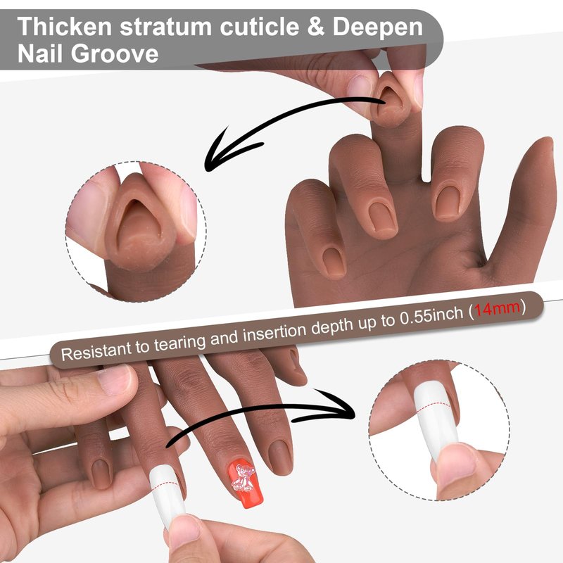 - 【Upgraded Deepen & Thicken Nail Groove】Silicone practice hand mannequin upgrades the nail bed , deepening nail groove can make false nail tips better embedded, increasing the thickness of the cuticle to prevent the cuticle from being damaged during use. You can insert the nail tips into the the nail bed about 14mm without glue. Suitable for nail art beginnings and nail salon artists.