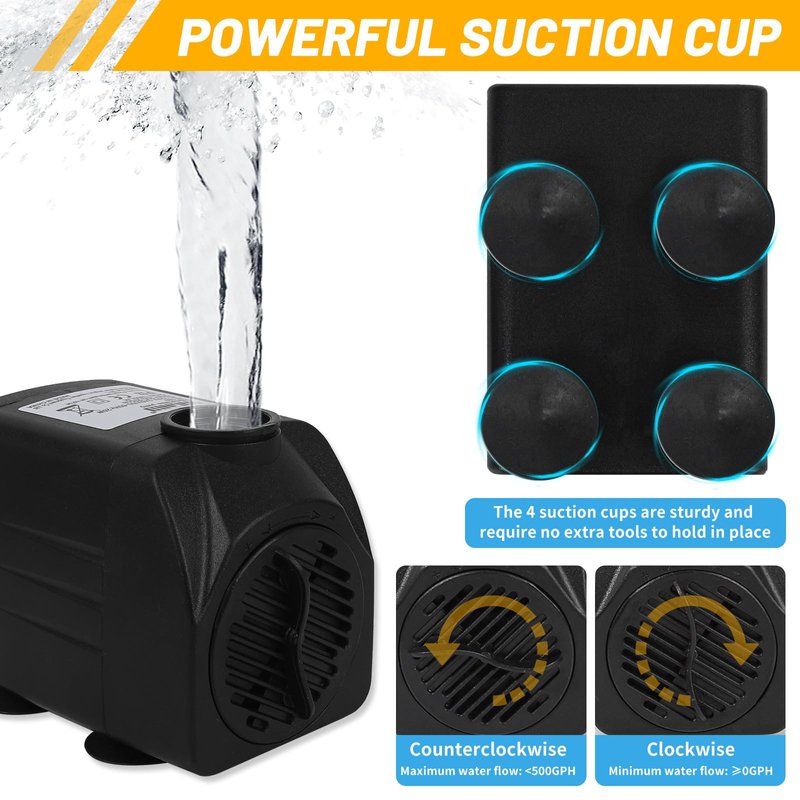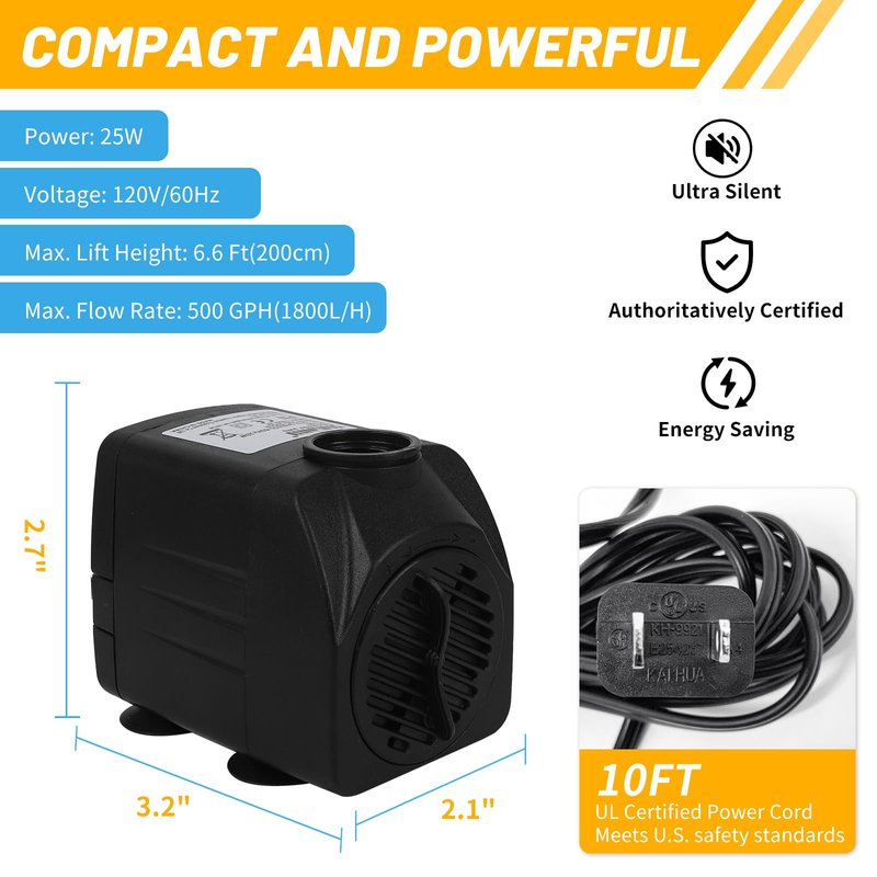 - UL CERTIFIED & WATER FLOW CONTROL: Our water pump has passed the rigorous UL certification and meets UL 778 standards. The adjustable knob controls the water flow, so you can easily create more water table fun. The maximum flow rate is up to 500GPH (1800L/H).