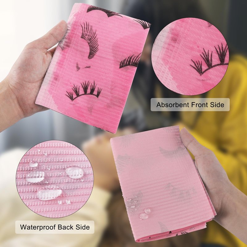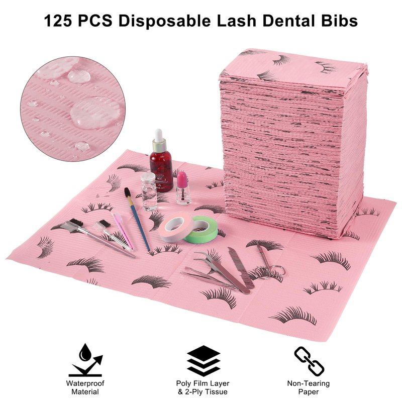 PRASNE Lashing Dental Bibs Disposable Pack of 125, Lash Pillow Cover of Lash Supplies, Pink 3-Ply Paper Poly Waterproof Towels, 13” x 18”, Black Eyelash Printed