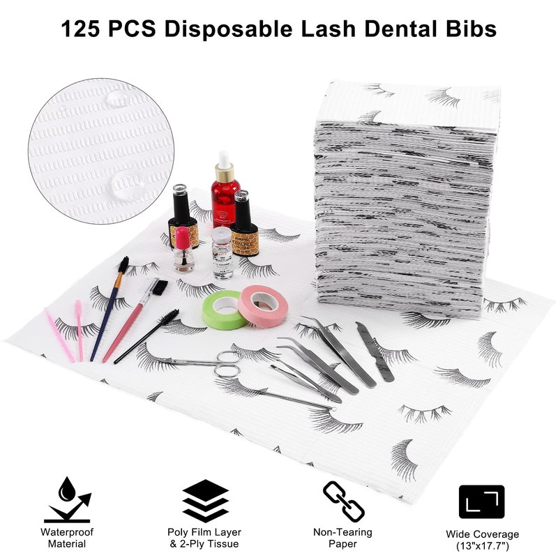 - [Package ]- - 125 PCS Disposable lash bibs are printed with fashional black eyelash and packed in a sealed bag to ensure cleanliness, each bib measures 13"x17" in size to provide maximum coverage and protection