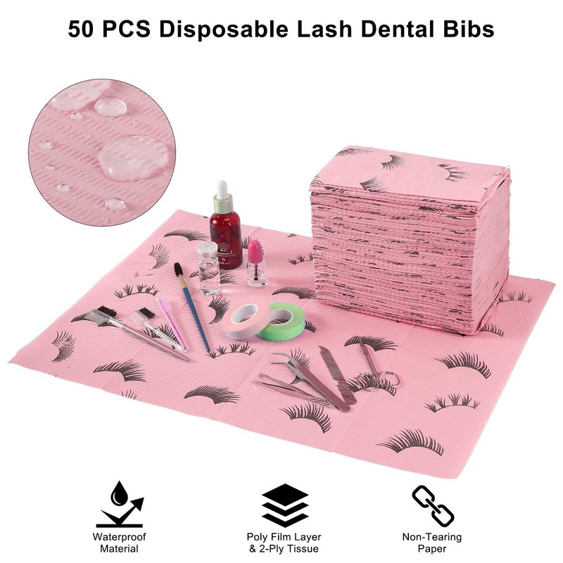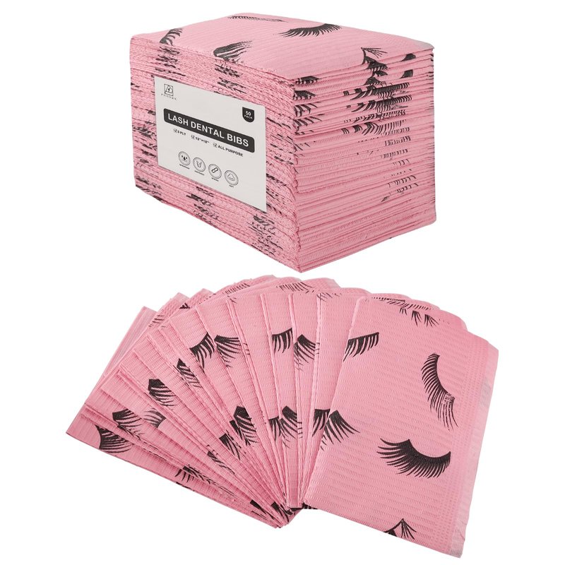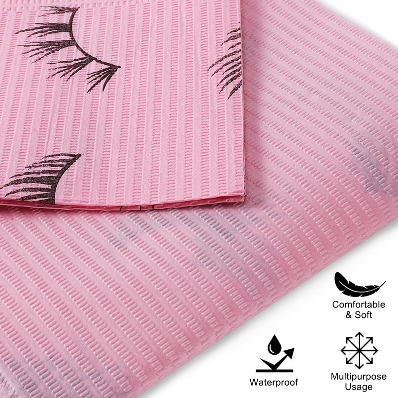 PRASNE Lashing Dental Bibs Disposable Pack of 50, Lash Pillow Cover of Lash Supplies, Pink 3-Ply Paper Poly Waterproof Towels, 13” x 18”, Black Eyelash Printed
