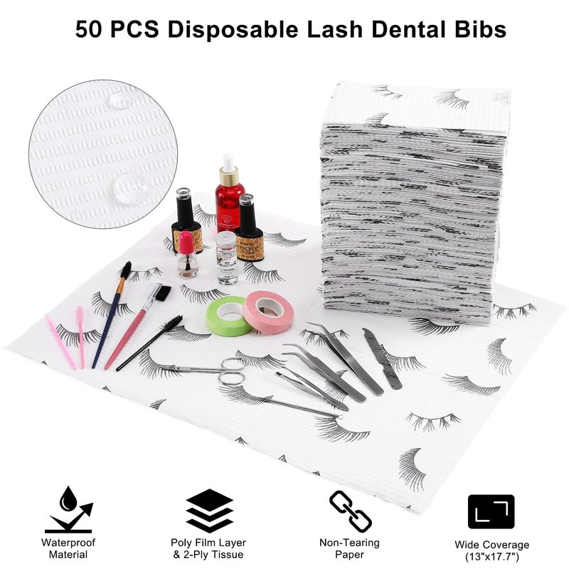 - [Package ]- - 50 PCS Disposable lash bibs are printed with fashional black eyelash and packed in a sealed bag to ensure cleanliness, each bib measures 13"x17" in size to provide maximum coverage and protection
