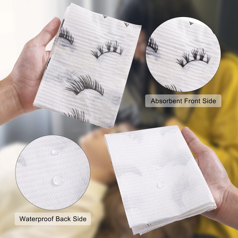 PRASNE Lashing Dental Bibs Disposable Pack of 50, Lash Pillow Cover of Lash Supplies, White 3-Ply Paper Poly Waterproof Towels, 13” x 18”, Black Eyelash Printed