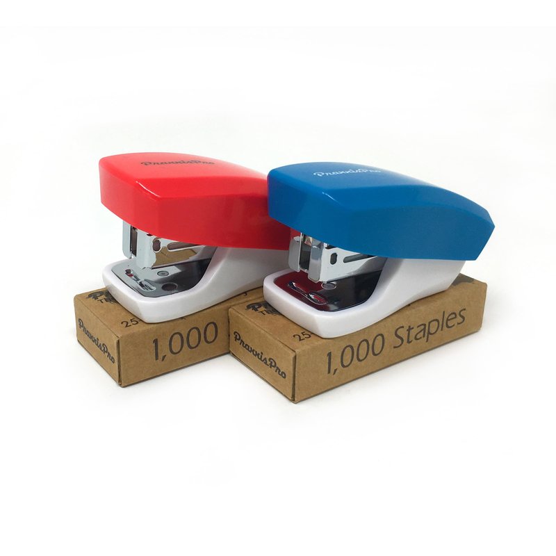 PraxxisPro Desk Accessories - Aria Premium Mini Stapler Set - with Built-in Staple Removers, 2000 Standard Staples Included - for Office, School, and Travel, Set of 2, Blue & Red
