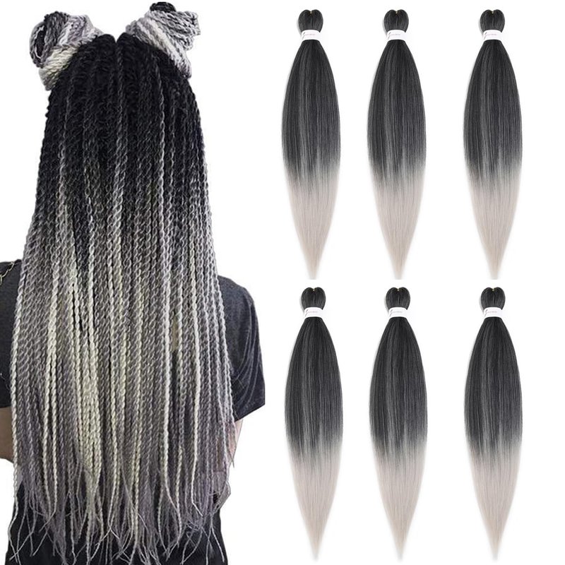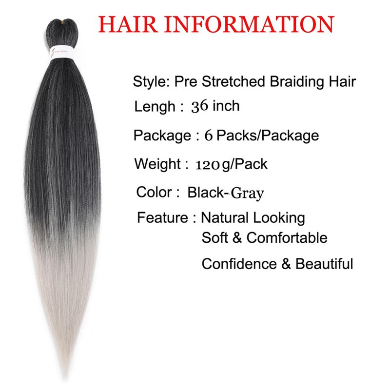 Pre Stretched Braiding Hair 36 Inch 6 Packs Ombre Braiding Hair Prestretched Crochet Braids Hair Professional Synthetic Braid Hair Extensions Hot Water Setting(36",1B/Gray)