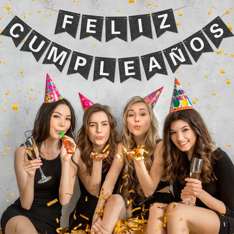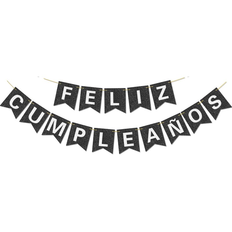 Pre-Strung Happy Birthday Banner - NO DIY - with Shiny Letters Glitter FELIZ CUMPLEAÑOS DECORATIONS Banner for Black Birthday Party Decorations and Supplies