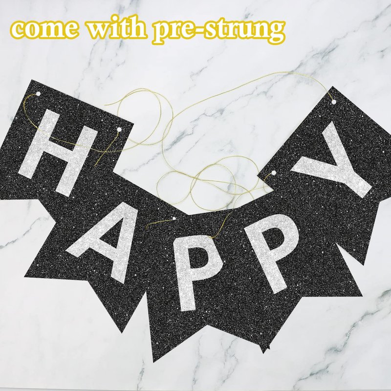 - Black Happy Birthday Banner Decorations - Includes black glitter birthday banner with shiny letters glitter HAPPY BIRTHDAY string pre-string, gorgeous decorations that made this birthday party perfect.