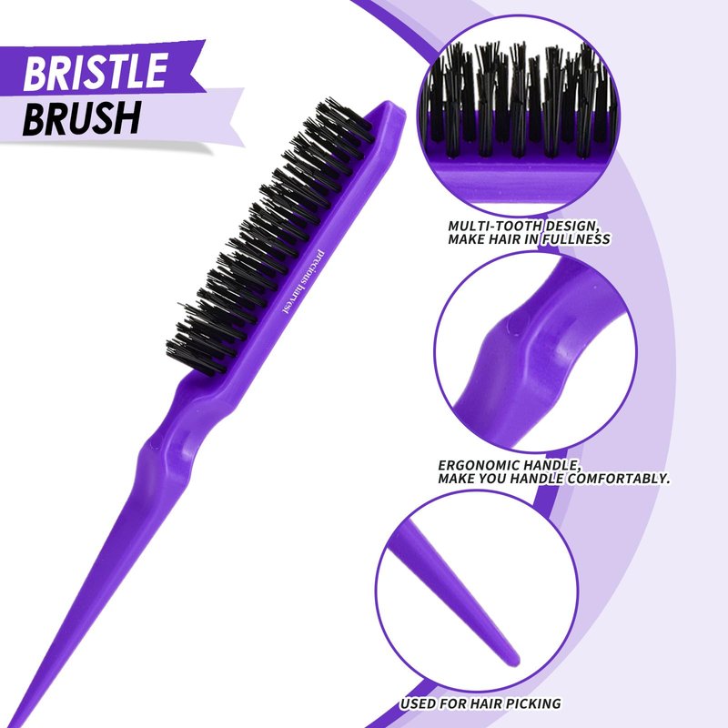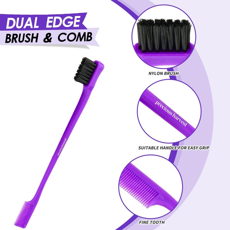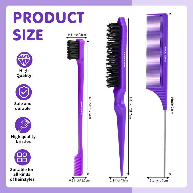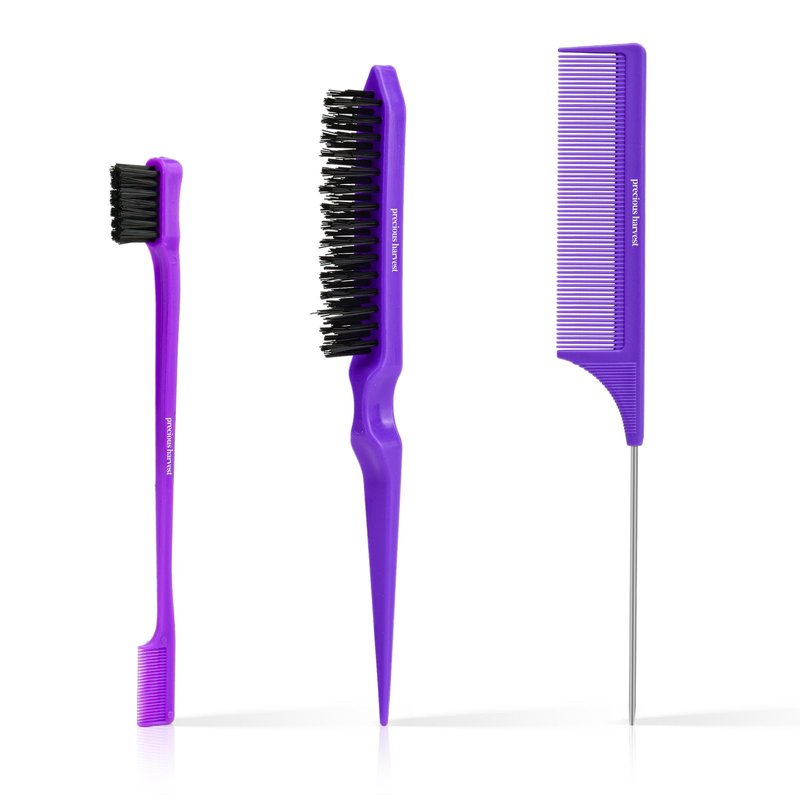 precious harvest Three-piece Hair Styling Rat Tail Comb Hair Brush Set,Double Sided Edge Brush for Edge & Back Brushing,Nylon Teasing Hair Brush with, Slicking Hair for Women Girls (Purple)