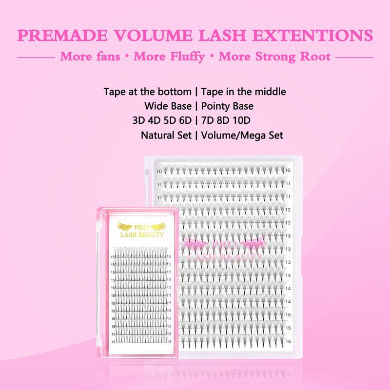 - SPECIFICATION : Pointy Base Premade Fans Eyelash Extensions have regular and large trays. Per regular tray has 120 fans and per large tray has 320 fans. Large Tray is available in 7D 8D 10D, 0.07 Thickness, C and D curl , 10 to 16 mm single length and 9-16 mix lengh.