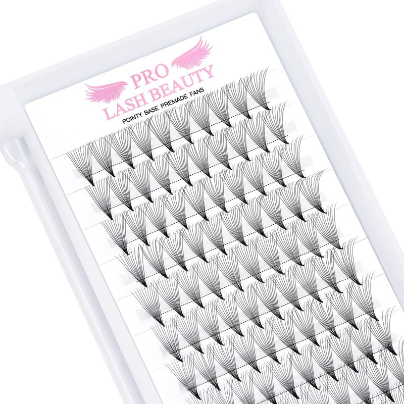 - Specification : Pointy Base Premade Fans Eyelash Extensions have regular and large trays that per regular tray has 120 fans and per large tray has 320 fans . Available in 3-14D , 0.05/0.07/0.10 , C and D curl , 9 to 16 mm single length and 9-16 mix length .