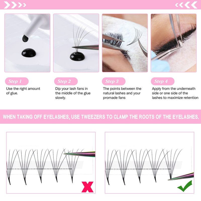 - Extremely Light Weight : Pointed base Fans are made from high quality PBT synthetic materials in order to reach stronger root and longer wear-time . Also the premade volume lashes are extremely light with lightly attached to the strip which means you can get it easily without efforts.