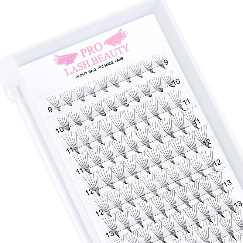 - Specification : Pointy Base Premade Fans Eyelash Extensions have regular and large trays that per regular tray has 120 fans and per large tray has 320 fans . Available in 3-14D , 0.05/0.07/0.10 , C and D curl , 9 to 16 mm single length and 9-16 mix length .
