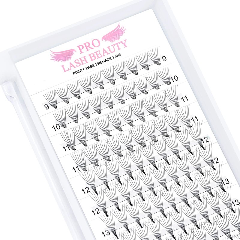 - SPECIFICATION : Pointy Base Premade Fans Eyelash Extensions have regular and large trays that per regular tray has 120 fans and per large tray has 320 fans . Available in 3-14D , 0.05/0.07/0.10 , C and D curl , 9 to 16 mm single length and 9-16 mix length .