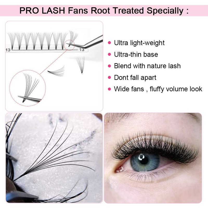 - Special Techniques for Roots : PRO pre made volume eyelash extensions use an unique double-heated bonding method to ensure the eyelash extension would not fall apart when take the fans off strip. The root of fan lash extensions are really tight and thin to be unnoticeable.