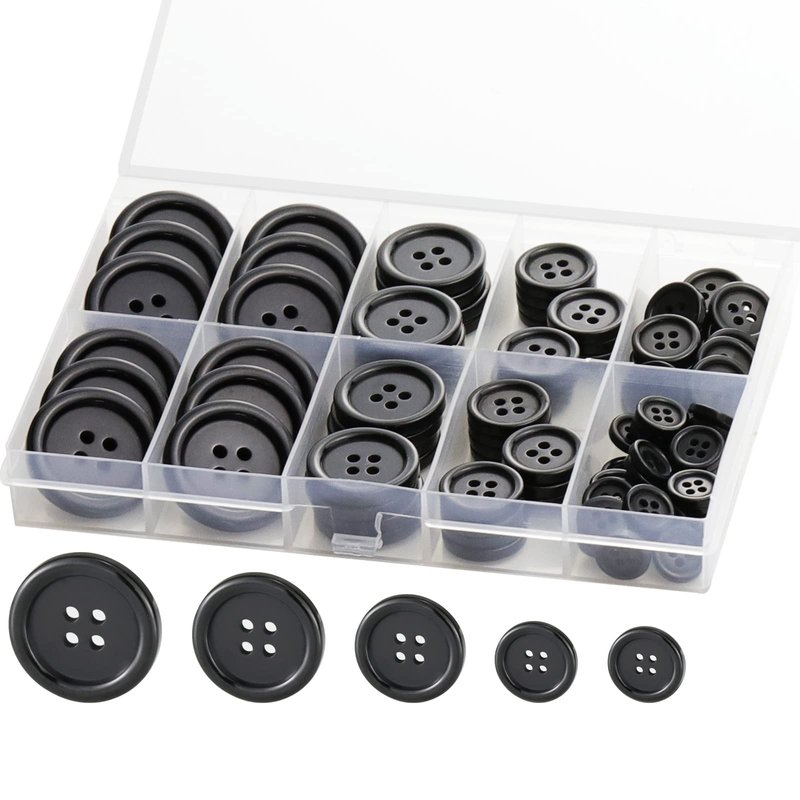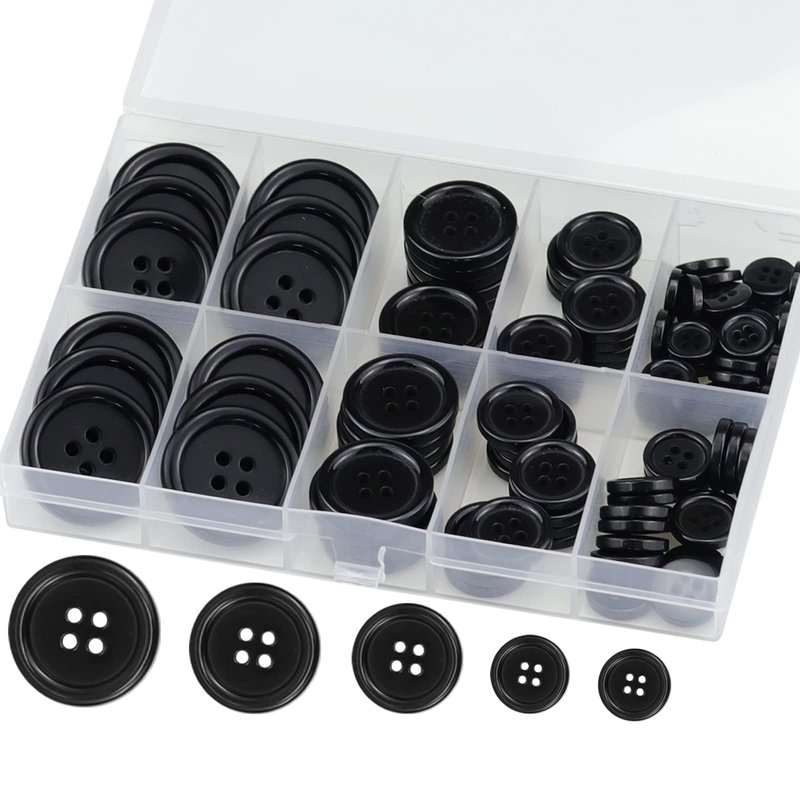 - 【Value for Money】100Pcs, four-hole black resin buttons, available in five sizes 0.39inch, 0.5inch, 0.6inch, 0.8inch and 1inch, offering you more choices to meet your different needs. These eco-friendly handmade DIY buttons are packaged in a clear plastic box.
