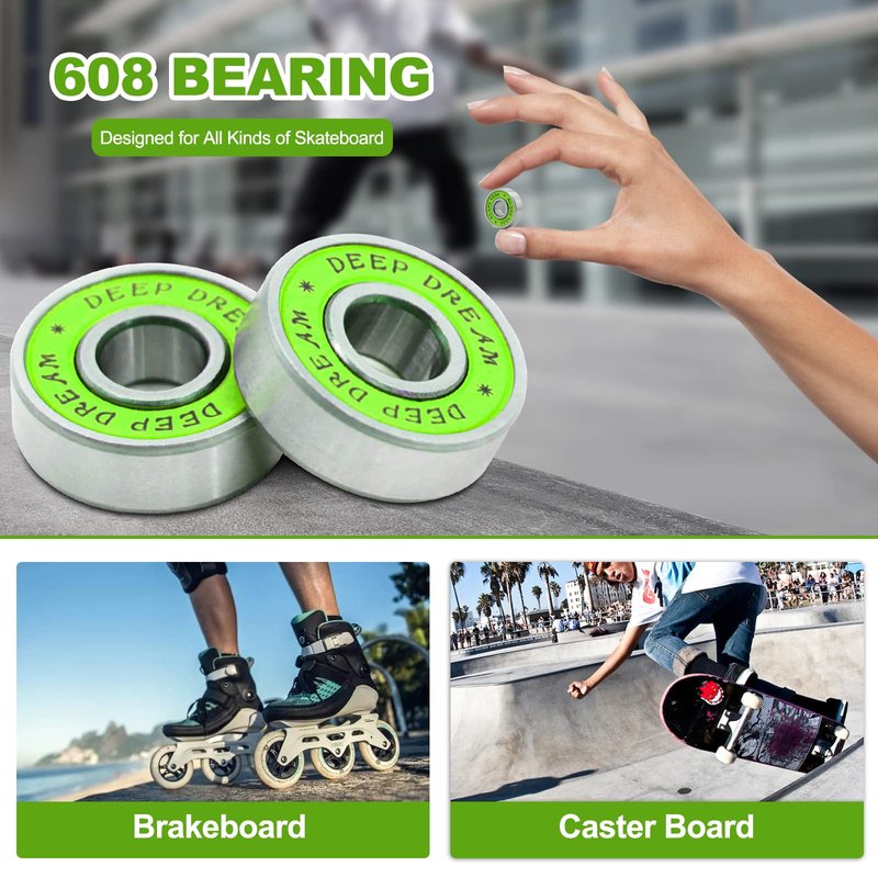 - Smooth and Fast Pre Lubricated Bearings:Skateboard Bearings contain a super fast, high speed lube that reduces friction to give riders a super smooth and fast ride.