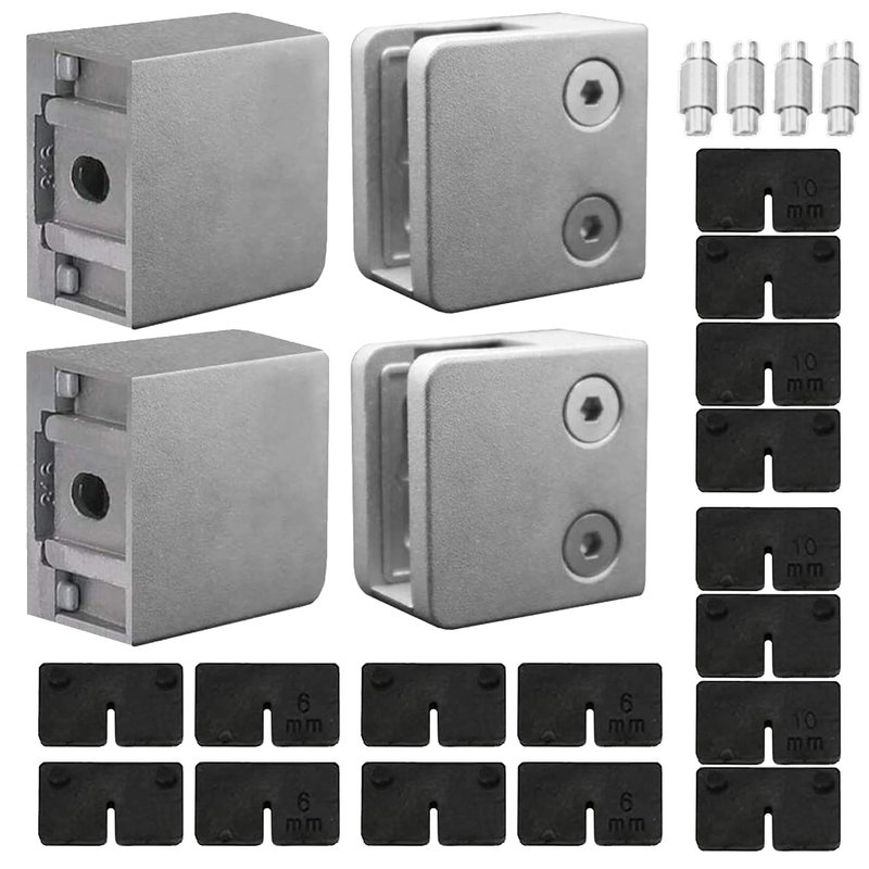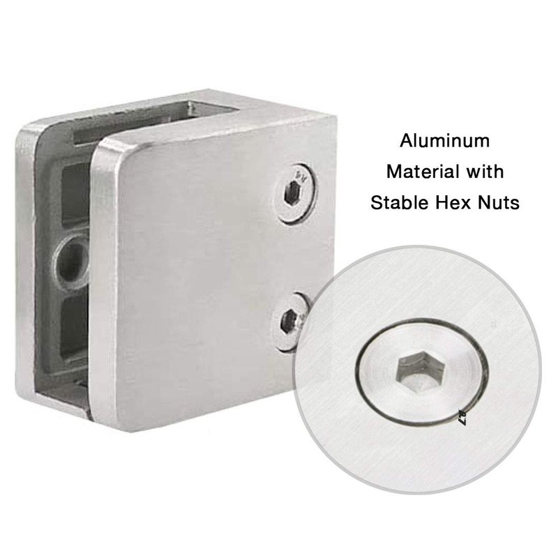 - PREMIUM ALUMINUM MATERIAL. This Brushed Finish square glass clamp and supports sets well built from aluminum material, more strong and sturdy, perfect for indoor and outdoor use, such as glass deck rail, glass deck railing, swimming pool rail, etc.