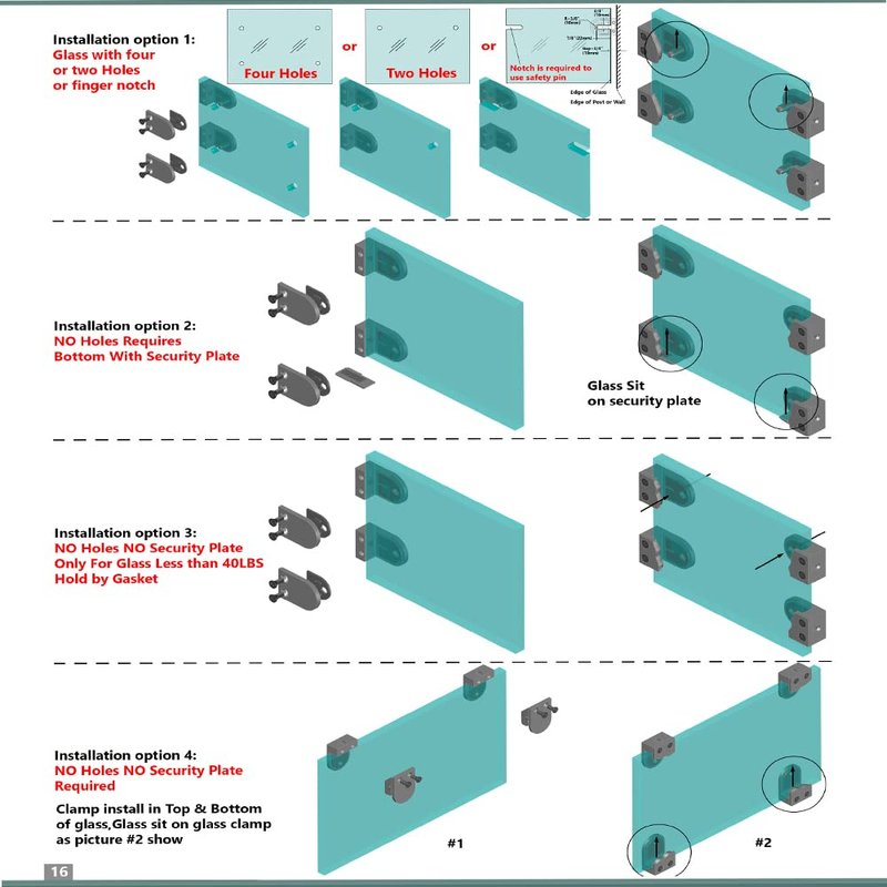- PACKAGE INCLUDES. (4) Glass Clamps, (8) 1/4" Glass Gaskets, (8) 3/8" Glass Gaskets, (4) Security Plates. Installation screws NOT included. Need to buy separately.