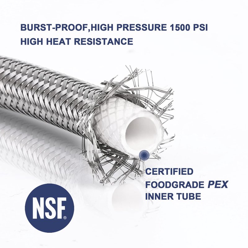 - DURABLE & BURST PROOF- Fabricated high quality with 304 stainless steel braiding, FOODGRADE PEX core and solid brass nuts; can withstand high water pressure 1500 PSI