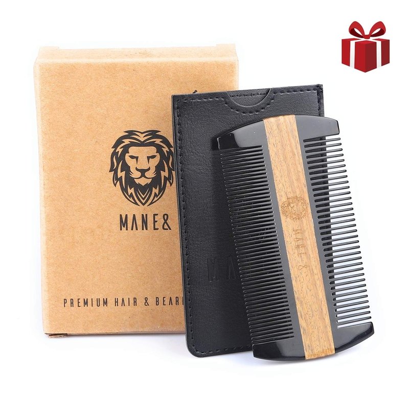 Premium Natural Ox horn and Sandalwood Dual-Action Beard Comb with Black Protective Case – the Perfect Beard & Mustache Grooming Companion & Gift for Men – by Man & Mane