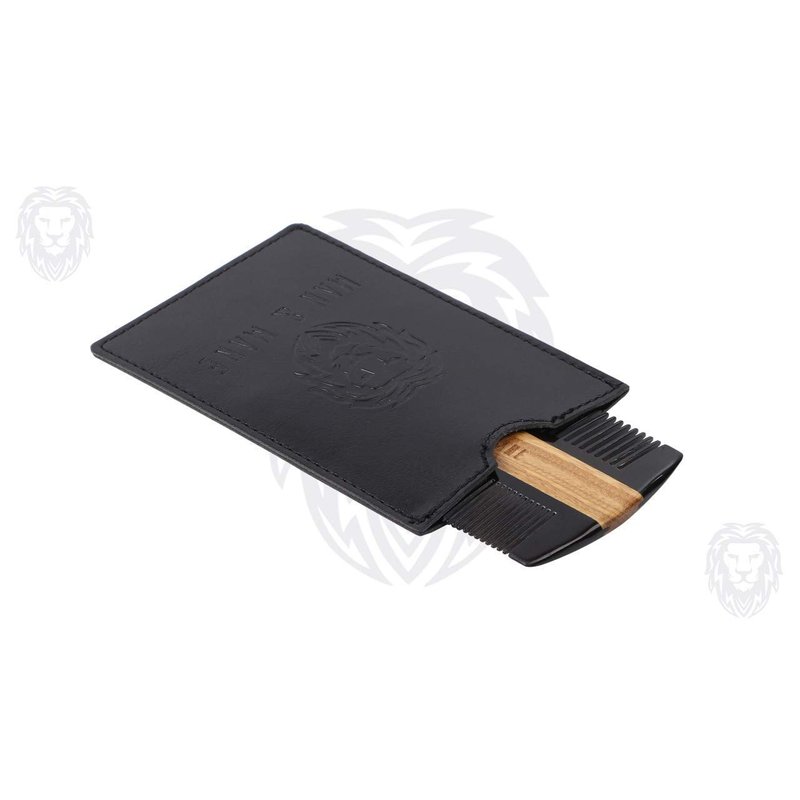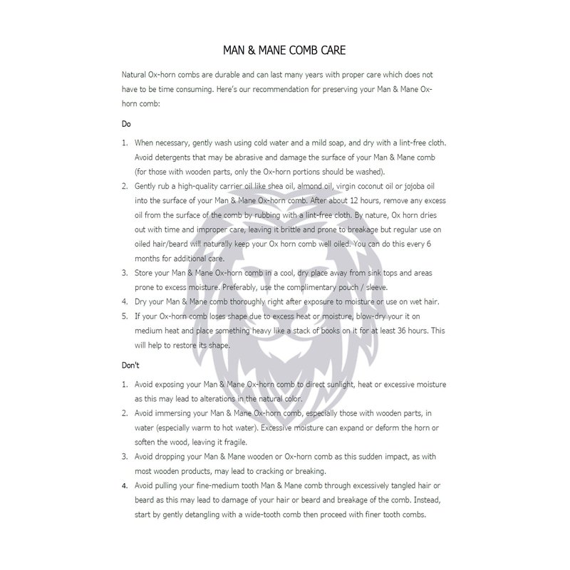 Our Man & Mane Beard Comb is made from solid 100% Genuine Ox horn. The double sided comb comes with wider teeth on one side for detangling and finer teeth on the other for a thorough run through. Together, the dual action teeth ensure superior grooming for every beard, mustache or hair type. Our Man & Mane Beard Comb is accompanied by a high quality PU Leather Sleeve for your carrying convenience. Test of Authenticity: No static, sinks in water versus plastic which floats, characteristic horn color and variation and distinct horn smell and burns with residual black powder versus agglomeration characteristic of plastic.