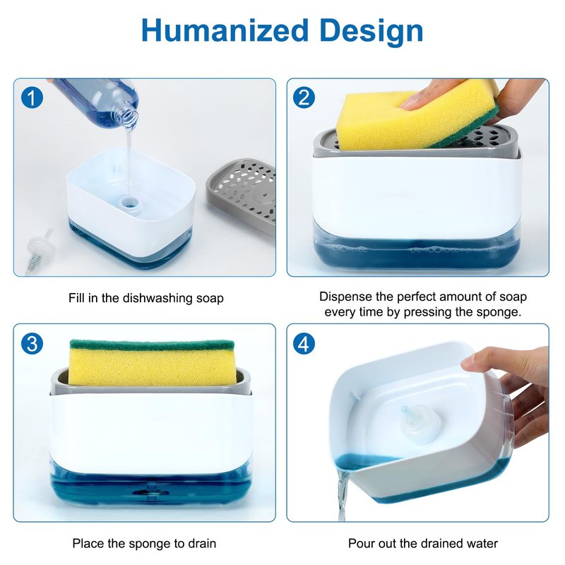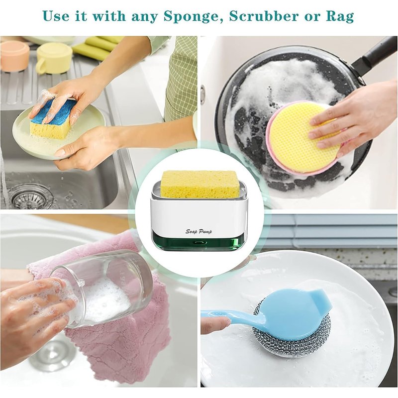 Our Dish sponge holder features a classic design that's incredibly easy to use. Simply press down on the top plate of the pump to dispense your desired amount of soap directly onto the included sponge dispenser. This soap pump dispenser innovative design not only saves you time but also helps you wash dishes faster and more efficiently.