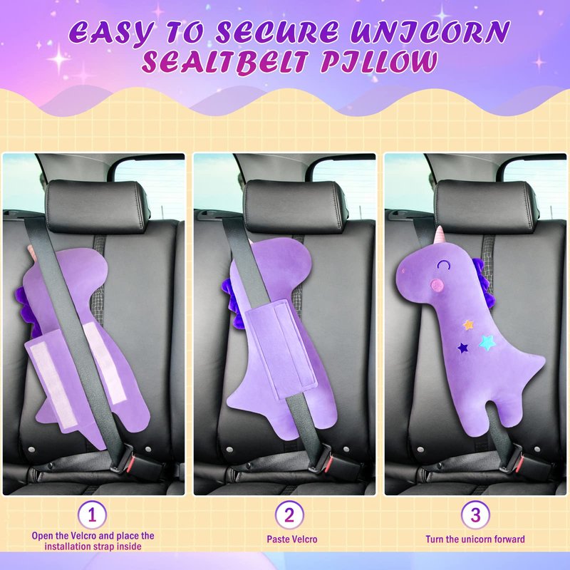 - 【Premium Unicorn Seat Belt Pad 】Our premium unicorn desig seat belt pad is a soft and comfortable seat belt cushion, designed to keep your child safe and comfortable during car rides. It provides superior support for your child's head, neck, and shoulders, so they can sleep soundly during long car trips.