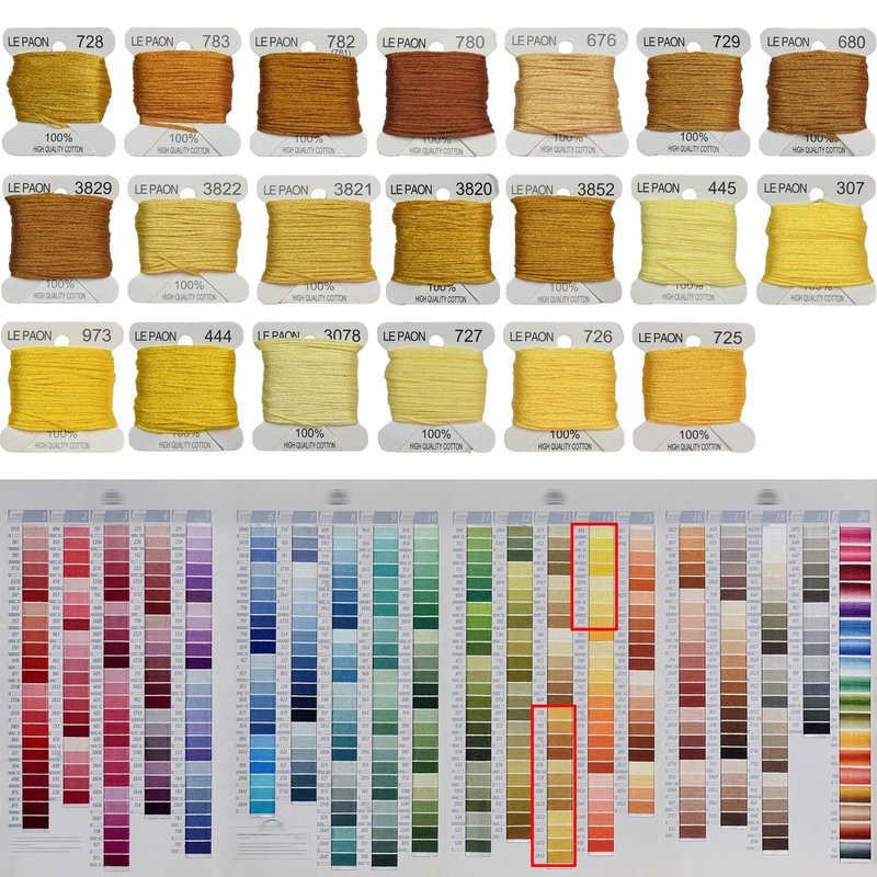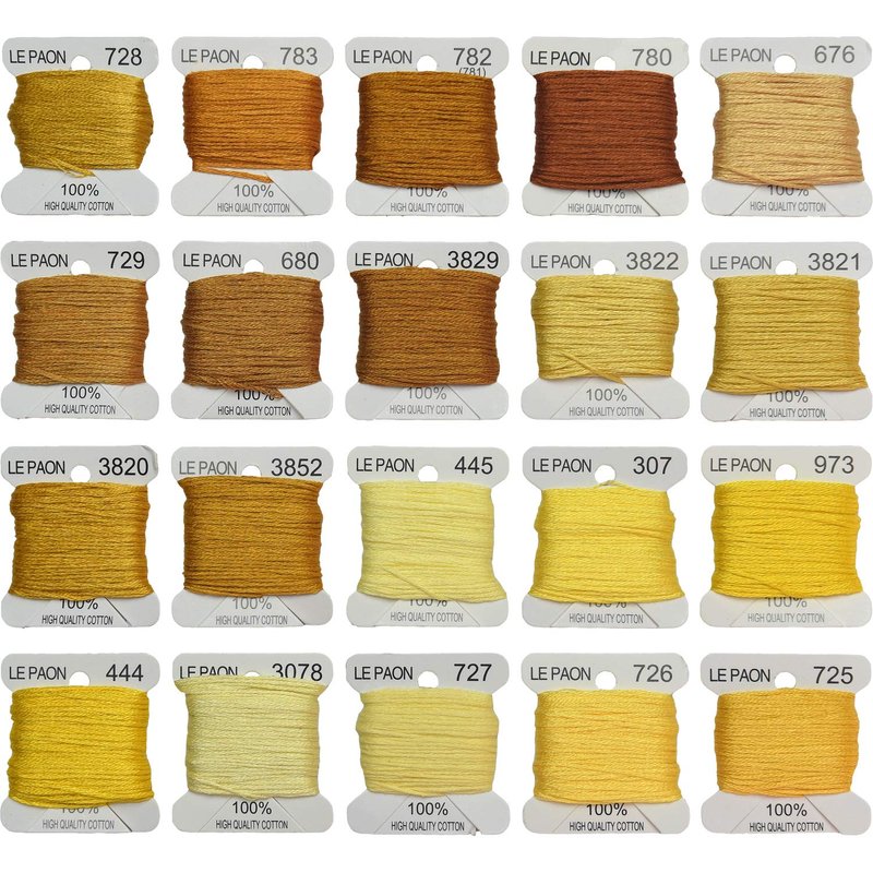 - Color: 20 Colors,all Colorfastt.All Bobbins Marked Color Number, Color Number are as follow:728,783,782,780,676,729,680,3829,3822,3821,3820,3852,445,307,973,444,3078,727,726,725