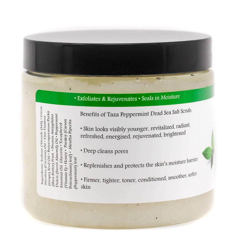 Premium Taza Peppermint Dead Sea Salt Scrub, 473 ml 24 oz (670 g) Exfoliates Your Skin Leaving it Soft and Hydrated Contains: Coconut Oil, Shea Butter, Grapeseed Oil, Sweet Almond Oil, 26 Minerals