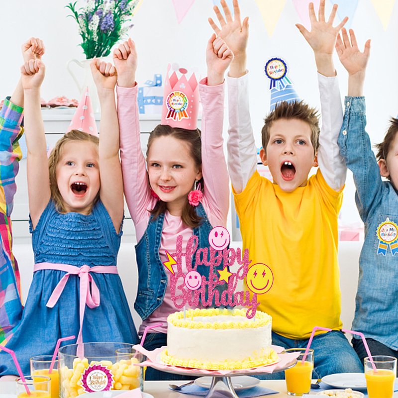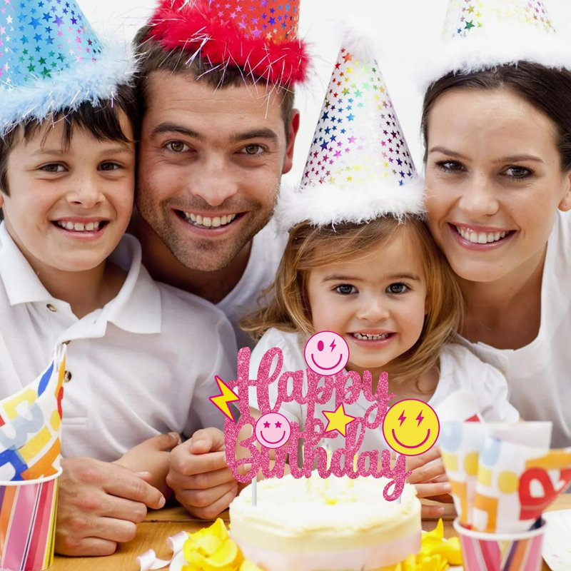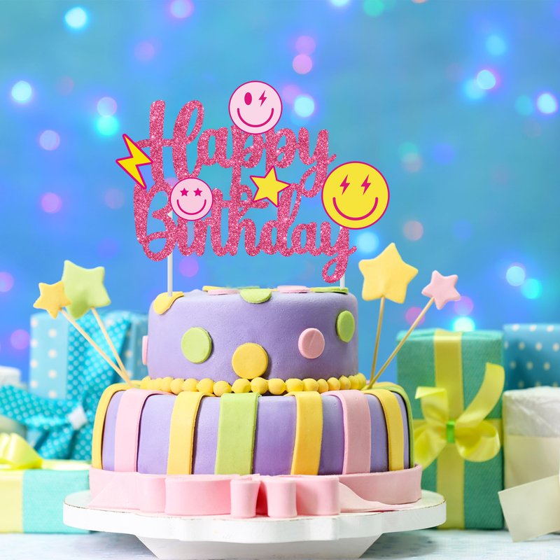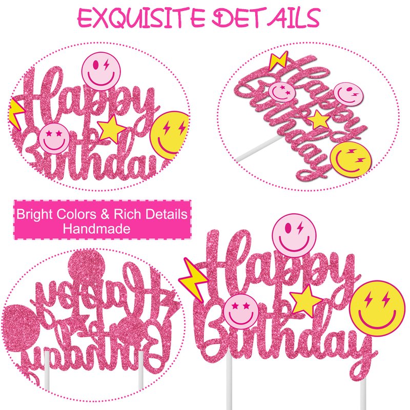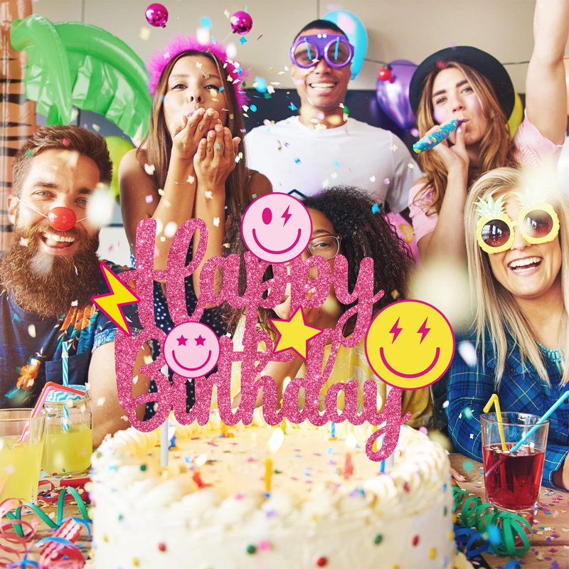 - 【1Pcs glitter smile face birthday cake topper】You will receive 1pcs passionate preppy themed birthday cake topper in this package. The exciting pattern is designed by 3 smile faces, 1 lightning, 1 star, across a shiny rose red Happy Birthday sign, make you can't put it down.