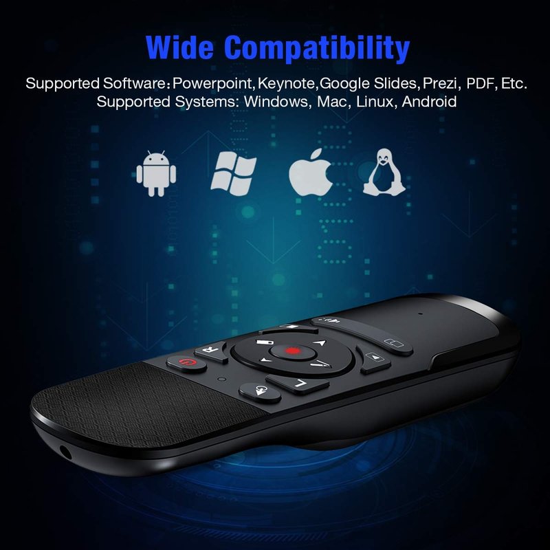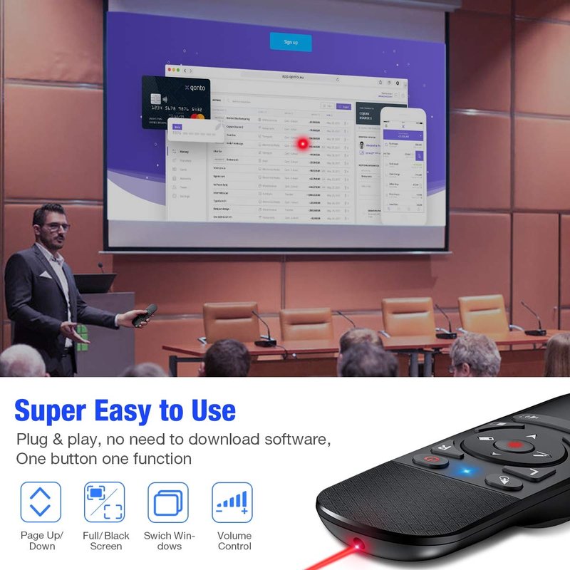 - 【Air Mouse Presentation Clicker】Clicker for powerpoint presentations combines the function of air mouse, with wireless cursor control button and left/ right mouse button, which makes it like a true mouse. With it in your hand, you can be totally free from the constraint of keyboard and make your presentation more efficient