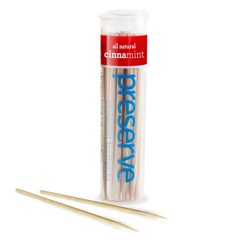 Freshens breath, keeps teeth and gums healthyMade of sustainably harvested birch wood grown in the USAFlavored with natural oilsConvenient carrying case made of 100% recycled plasticApproximately 35 toothpicks per canisterUsing a toothpick after a meal freshens your breath and keeps tooth decay at bay. With Preserve Flavored Toothpicks, it can also be delicious habit. We use spicy, all-natural oils for a big burst of flavor. Our mint with tea tree flavor contains peppermint, spearmint, menthol and tea tree oils, while cinnamint includes cinnamon, peppermint, menthol, wintergreen and clove. The Toothpicks also meet our high environmental standards. They are manufactured from sustainably harvested birch grown in the USA, and packaged in a pocket-sized canister made from 100% recycled plastic.