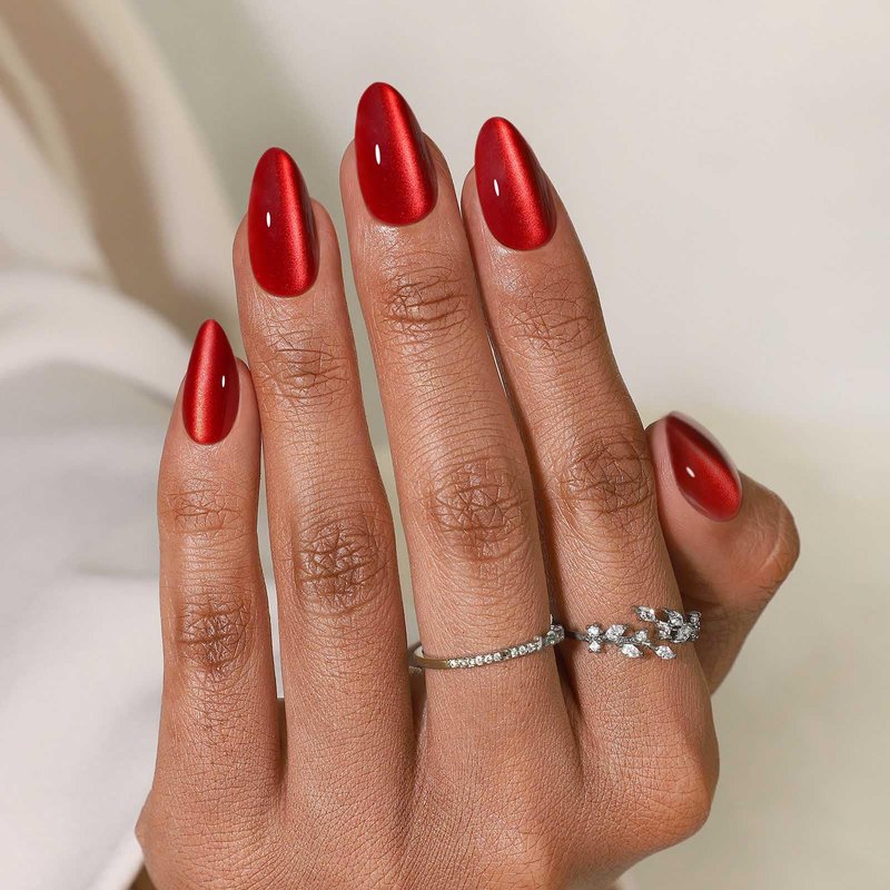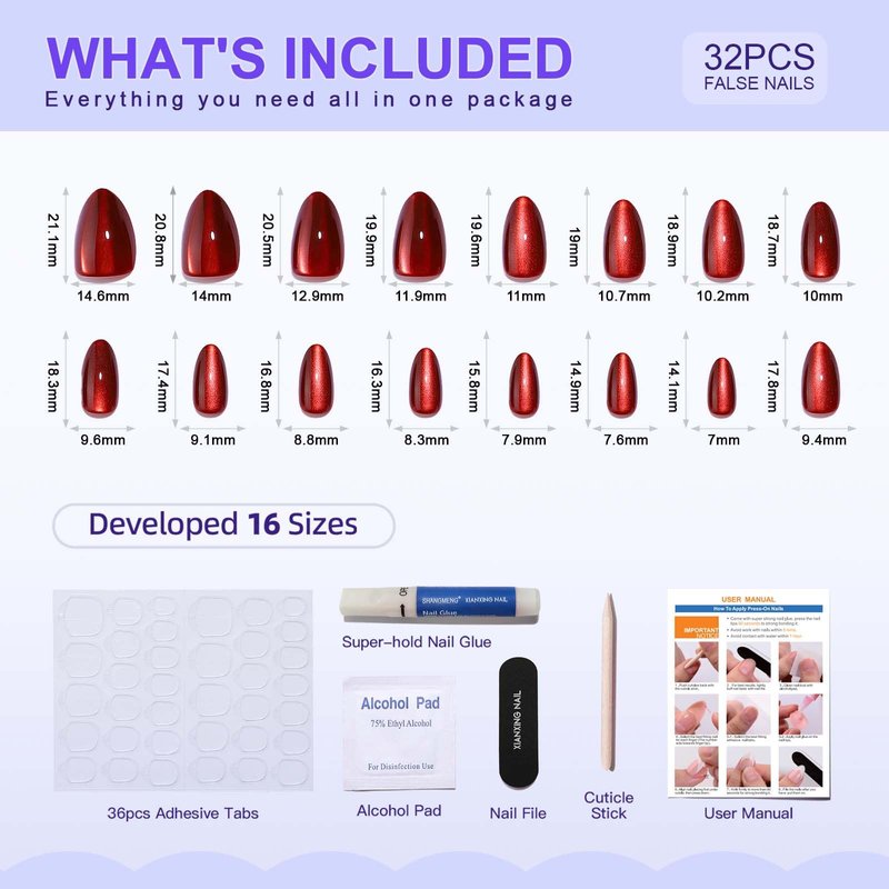 Press on Nails Almond - SHANGMENG Cat Eye Press on Nails Short with Nail Glue, Fit Perfectly Fake Nails for Women Gift, Opaque Stick On Nails in 16 Sizes - 32 Reusable Nails Kit, Wine Red