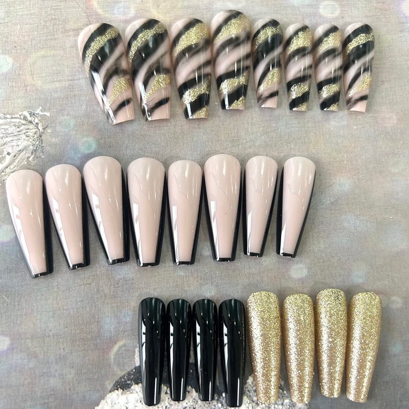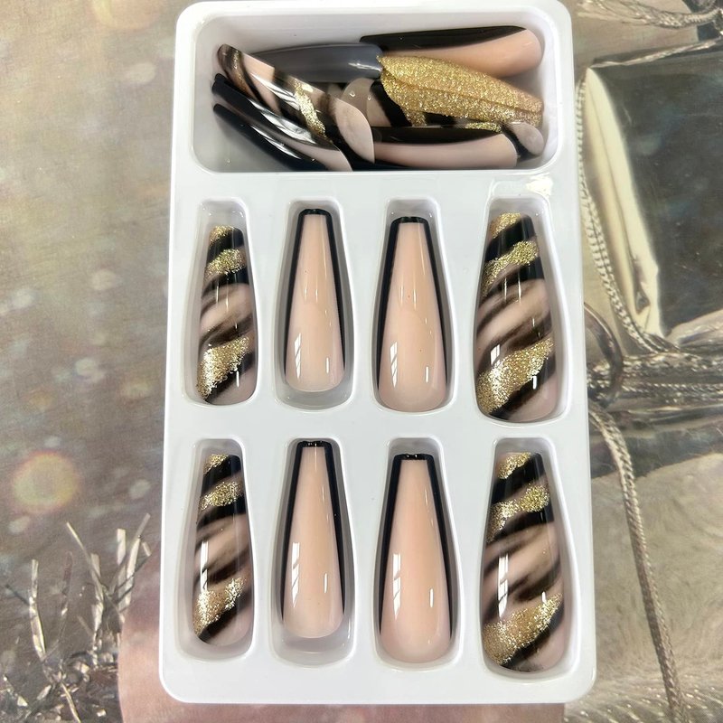 - 【Package Include】You'll get 24 pieces of extra long black with gold foil designs fake nails with delicate designs, you can choose the most suitable false nail for yourself, it is easy to trim and file them to in any length and shape you like.1 mini nail file, 1 small wooden stick, 1 piece of nail glue sticker and 1 piece cleaning paper. Glue on nails are perfect for most people's nails.