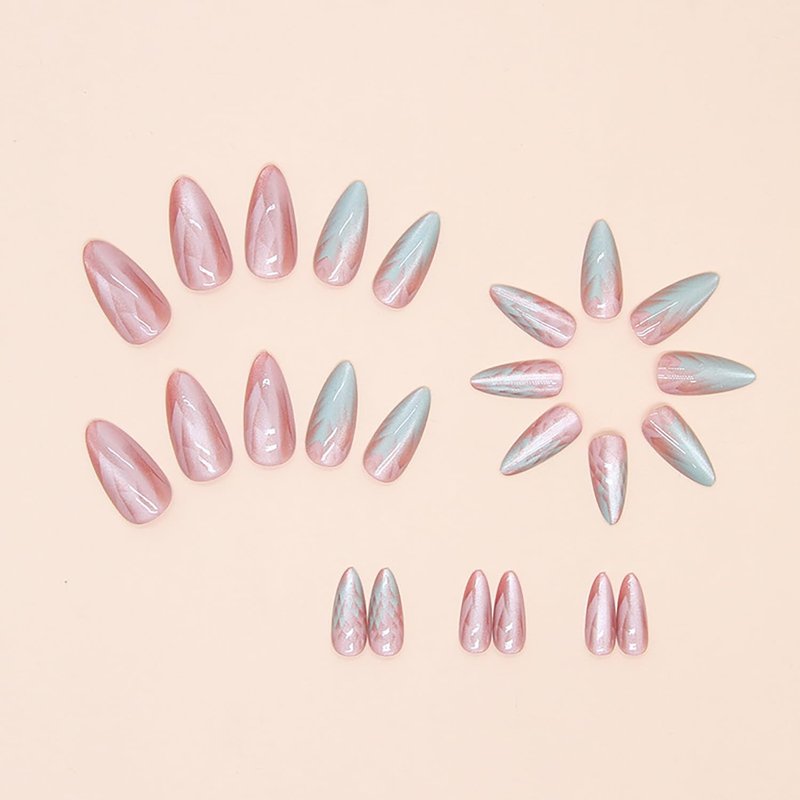 Press on Nails Medium Almond MABKJLF French Fake Nails Full Cover Gradient Cat Eye False Nails with Designs Pink Green Glossy Glue on Nails Acrylic Nails Artificial Nails for Women Girls 24Pcs