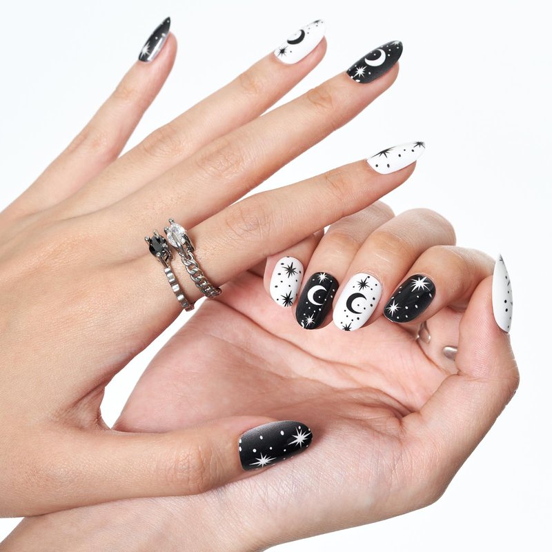 Press on Nails Medium Oval, GLAMERMAID Black and White Moon Stars Glue on Gel Nails, 24Pcs Short Acrylic False Nails Kits Reusable UV Finish Full Cover Stick on Nails for Women Gifts