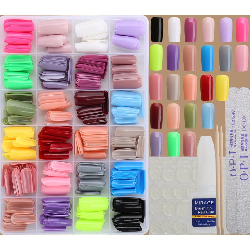 - Package Include:24 packs 576pcs glossy press on nails set(24 color),2pcs nail sticks,1pcs 100/180 nail file and 1pcs 180/240 nail file,2 sheets 48pcs adhesive nail tabs,1pcs 10g nail glue.All fake nails are packed in a transparent plastic box with 24 grids,easy for you to reach out.