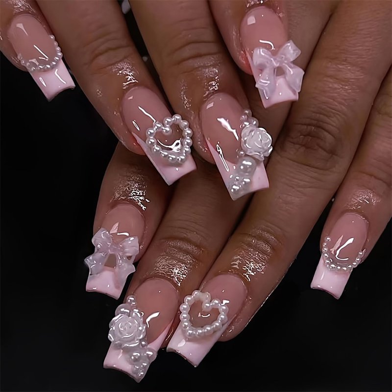 Press on Nails Medium Square Love Heart Pearl False Nails Artificial Acrylic Nails Flower and Bow Tie Design French Fake Nails Full Cover Reusable Coffin Nails Glue on Nails for Women Supplies 24Pcs