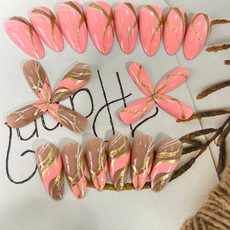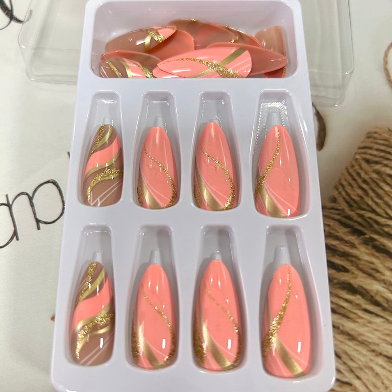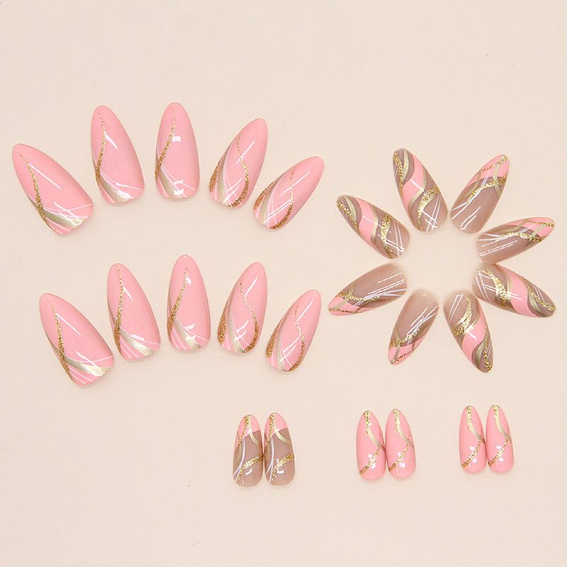 - Easy to Use: Artificial fingernails with glue sticker can get your favorite manicure in just 5 minutes without waiting at the nail salon. Golden ripple nails with shine give you more beautiful, pink also can have you cute and sweet. Some simple steps allow you to get the same impressive professional effect at home.