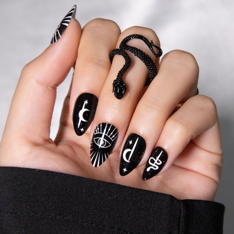 - Apply All Your Daily Chores: "Simple black base with stars, moon, eyes and snakes classic pattern, will add a touch of charm and cool to your manicure." Our Press on nails are made of UV gel finish with HighGlossFit technology, that polish-free, never fade.