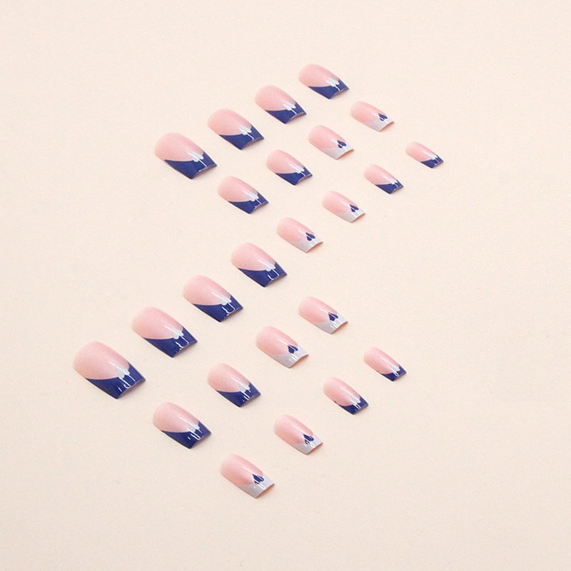 Press on Nails Short Medium Square Nails 24 Pcs, French Blue White Fake Nails with Heart Accents - Glue Nail Kit Reusable Acrylic False Nails for Women, Blue Heart Square